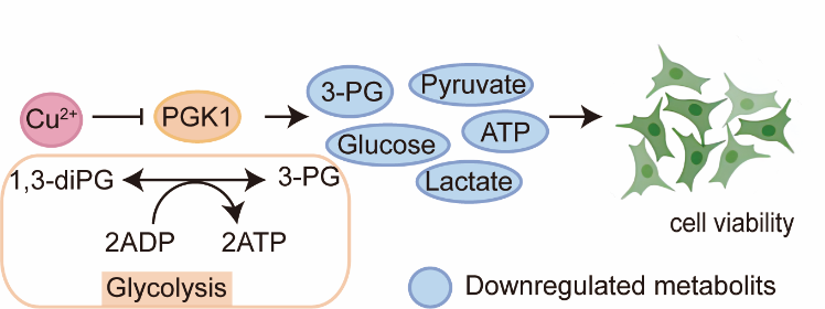 Figure 1. Workflow of the CysMP strategy. (Image by YUAN Yamei and ZHANG Yaoyang) CysMP systematically profiles protein–metal interactions in mammalian cells with unprecedented depth and accuracy, revealing how these essential elements reshape cellular proteome. The study identified 8,895 metal-binding cysteine sites across 4,150 proteins—the most comprehensive cysteine-centered metalloprotein dataset reported to date—enabling quantitative comparisons among different metals and uncovering both binding promiscuity and selectivity. Among the discoveries, zinc and copper ions exhibited the broadest range of protein interactions, revealing unexpected metalloproteins involved in key biological pathways. Notably, CysMP identified copper and zinc binding to the enzyme 5′-methylthioadenosine phosphorylase (MTAP), which inhibited its enzymatic activity and led to MTA accumulation—a phenomenon that could have profound effects on cellular metabolism. Even more strikingly, copper ions were found to suppress the activity of phosphoglycerate kinase 1 (PGK1) (Figure 2), a central enzyme in glycolysis, thereby downregulating glycolysis-related metabolites and reducing cell viability. The copper-dependent regulation of PGK1 revealed by CysMP also provides new molecular insights into the recently emerging concept of cuproptosis—a copper-induced cell death pathway—highlighting how metal ion homeostasis is tightly coupled to metabolic control and cell fate decisions.